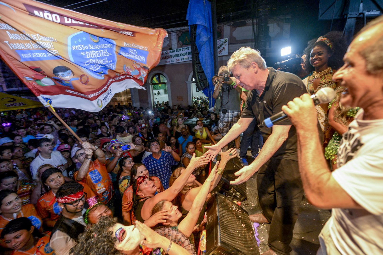 O prefeito de Manaus, Artur Virgílio Neto, esteve presente em duas das principais bandas da cidade na noite deste sábado: da Bica e da Difusora, ambas no Centro. Nas duas, ele subiu ao palco e chamou a atenção da população para o combate à exploração sexual infanto-juvenil e ao trabalho infantil. Acompanhado pela primeira-dama e secretária municipal de Assistência Social e Direitos Humanos, Goreth Garcia Ribeiro, ele destacou a intensificação dos trabalhos de vigilância e combate às práticas durante o período carnavalesco.