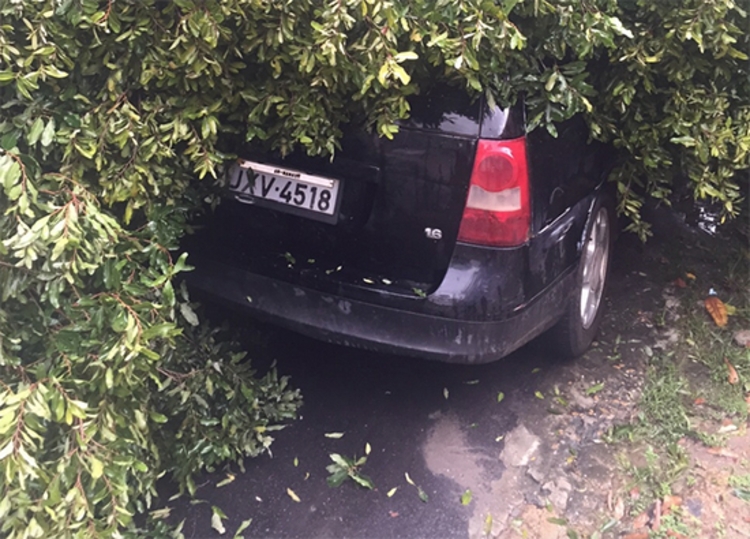Já a Parati, também preta, de placas JXV-4518, que estava estacionada na mesma rua não deu tanta sorte e foi atingida pelos galhos da árvore.