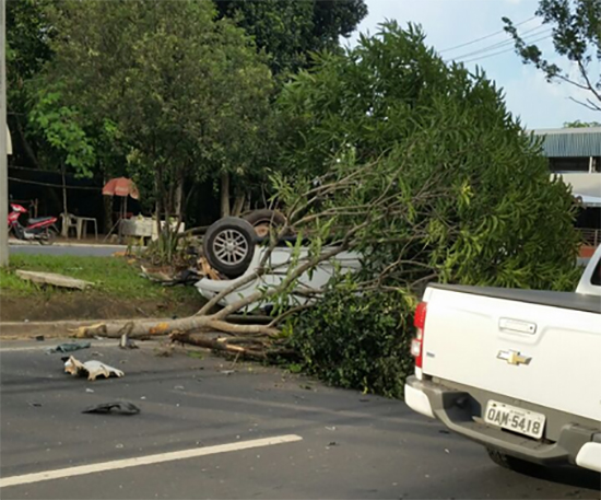 Depois de bater em uma árvore em alta velocidade, veículo capotou e o motorista foi atendido por equipe médica do Samu. Mais informações em momentos.