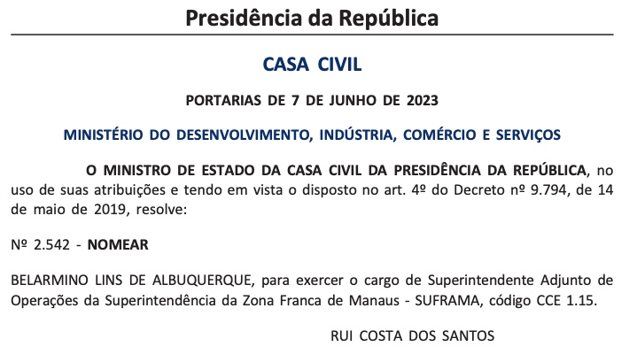 Manaus/AM - O ex-deputado estadual Belarmino Lins foi nomeado para cargo na Superintendência da Zona Franca de Manaus (Suframa). Belão vai assumir o cargo de superintendente adjunto de operações da Suframa.