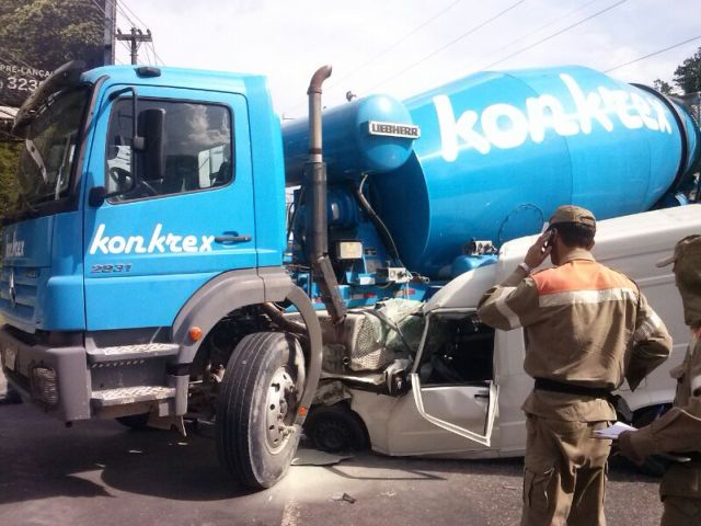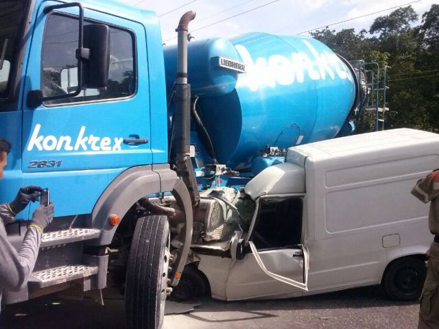 Manaus/AM - Em acidente na avenida Santos Dumont, às 14h45, caminhão betoneira da Konkrex colidiu com pick up que ficou embaixo da betoneira. Apesar do choque, não há registro de vítimas. O trânsito ficou congestionado no local