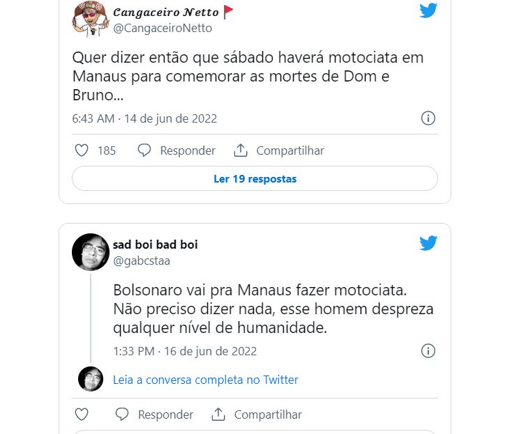 Outro é ainda mais direto: “Quer dizer então que sábado haverá motociata em Manaus para comemorar as mortes de Dom e Bruno”.