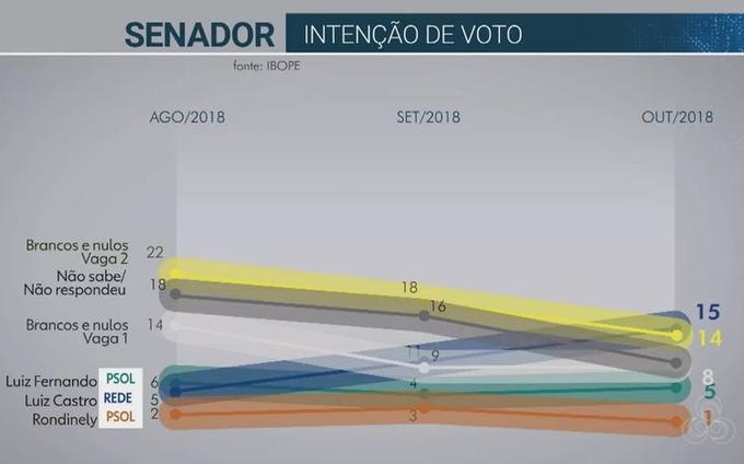 Entre os demais candidatos Alfredo Nascimento (PR) surge com 29%, seguido de Hissa Abrahão (PDT) com 16%, depois vem Luiz Castro (Rede) com 15%, Luiz Fernando (PSOL) com 5% e Rondinelli Fonseca (PSOL) com 1%. Os votos brancos e nulos são de 14% para a segunda vaga ao Senado, não souberam responder 8% e brancos e nulos para a primeira vaga foi de 8%.