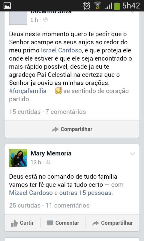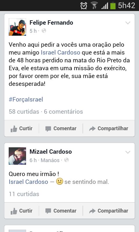 Israel Cardoso, cabo do Exército Brasileiro (EB), está perdido nas matas do município do Rio Preto da Eva desde quinta-feira, 08. Segundo Gerson Vieira, amigo do militar, Israel Cardoso teria contactado por celular com a esposa,Marianne Guimarães, informando que ele e mais outros companheiros de farda estariam perdidos. O contato, segundo ele, teria sido breve porque a bateria do celular de Israel teria se esgotado. Até o momento nenhuma autoridade militar se manifestou sobre o assunto, embora informnações extraoficiais dão conta de que várias equipes do Exército Brasileiro estão empenhadas na busca do militar. De acordo com informações de familiares, Israel Cardoso serve no Centro de Embarcações do Comando Militar da Amazônia (CECMA), locolizado na Avenida coronel Teixeira, Compensa.