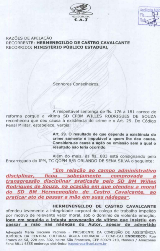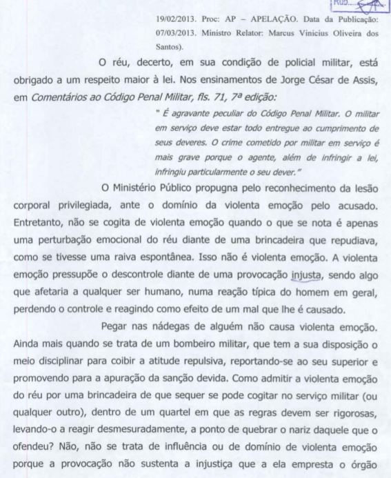 O cabo Hermenegildo de Castro cavalcante, do Corpo de Bombeiros do Amazonas, foi condenado a três meses de detenção depois que bateu violentamente no soldado Willes Rodrigues de Souza, que pegou na sua bunda. A defesa do cabo alegou que ele agiu tomado por"motivo de relevante valor moral", mas a Justiça Militar entendeu que "pegar nas nádegas de alguém não causa violenta emoção. Ainda mais quando se trata de um bombeiro militar, que tem à sua disposição o meio disciplinar para coibir a atitude repulsiva".