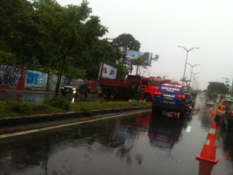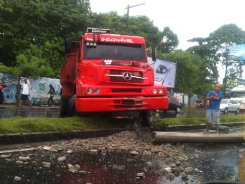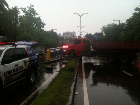 Uma caçamba que descia a avenida Mário Ypiranga, em direção à bola do Eldorado, perdeu o controle, atravessou a pista, subiu o canteiro e derrubou um poste da via.