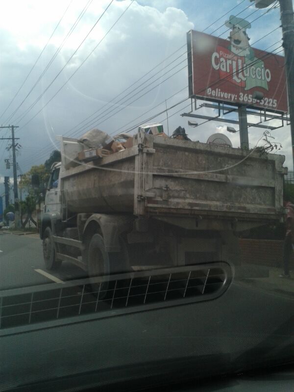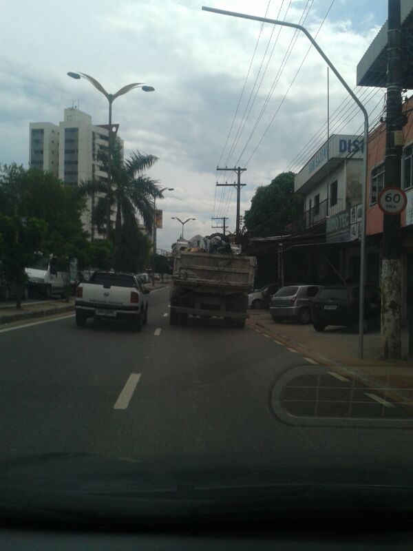 Manaus - Uma caçamba com entulhos transitava livremente e sem proteção na estrada da Ponta Negra deixando galhos de árvores e pedras pelo caminho. Por sorte alguns carros não foram atingidos. A Legislaçao de trânsito prevê proteção para esse tipo de carga. Motoristas reclamavam do risco que representa esse tipo de infraçao, nem sempre detectada pelos órgãos de trânsito.