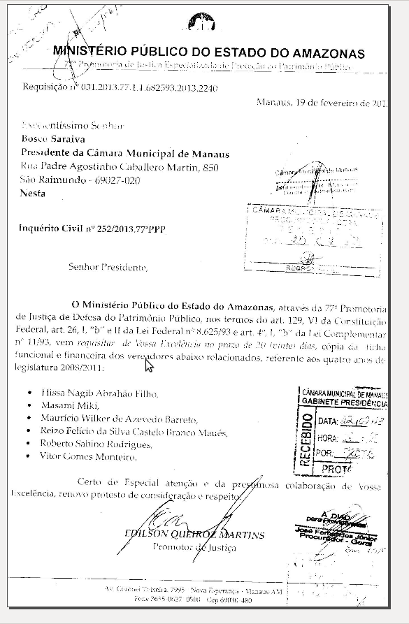 "No documento encaminhado pelo promotor de Justiça Edilson Queiroz Martins, foi dado um prazo de 20 dias para que a Casa encaminhar cópia da ficha funcional e financeira dos vereadores e ex-vereadores, referente aos quatro anos de legislatura 2008/2012, conforme cópia do documento que encaminhamos em anexo a este e-mail, conforme determinação do presidente da CMM, vereador João Bosco Gomes Saraiva.