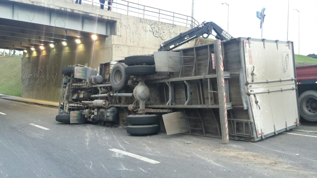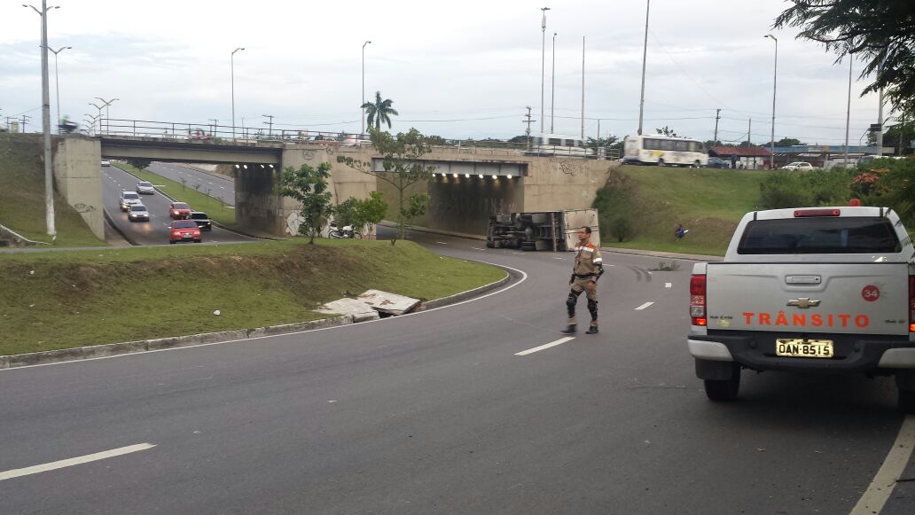 Uma carga mal acomodada teria causado o tombamento de um caminhão na entrada subterrânea do viaduto de acesso à Max Teixeira na tarde desta terça-feira (14).