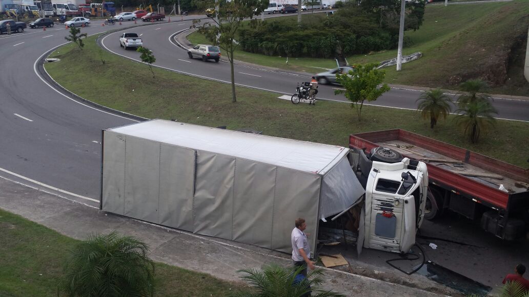 O caminhão, placa JWZ-8641, de propriedade da Transportadora Souza, fazia o carregamento de um molde de quatro toneladas. No momento em que realizava a curva, o molde teria tombado e causado o acidente.