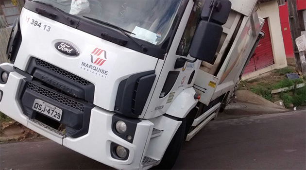 Manaus/AM - Caminhão coletor de lixo da empresa Marquise, de placas OSJ-4729, de Fortaleza, perdeu controle, desceu ladeira de ré e findou por bater em uma residência na rua Danilo Corrêa, bairro Petrópolis, zona Sul. Não há informações sobre feridos.