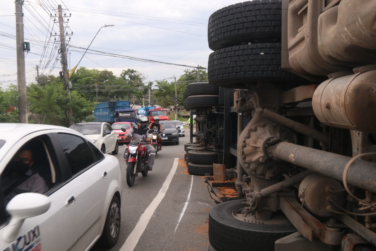 Manaus/AM - Uma carreta com aproximadamente 26 toneladas tombou nesta terça-feira (9), durante horário de grande fluxo de veículos, e congestionou o trânsito na avenida Buritis, na Zona Leste de Manaus.