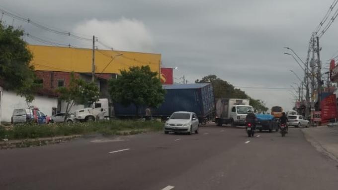 Agentes do Manaustrans estão não local e isolaram a área, pois há riscos de que o contêiner tombe completamente. Pelas imagens é possível notar que uma das rodas da carreta quebrou na curva e o compartimento de cargas está inclinado no trecho.