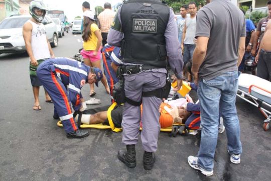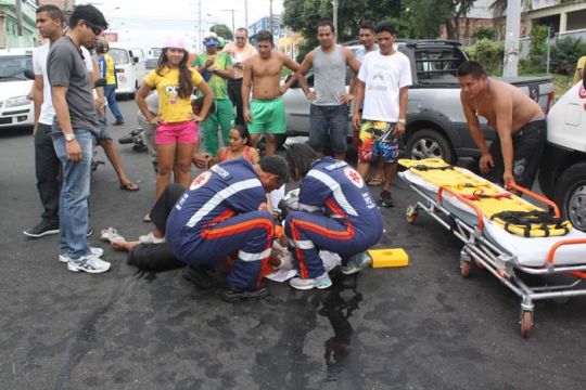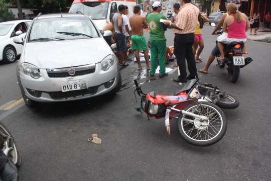 Manaus/AM - Colisão entre carro e uma motocicleta na avenida Tefé, esquina com a rua 7, do bairro Japiim 1, Zona Sul, deixou um homem com o pé quebrado e uma mulher com ferimentos leves.