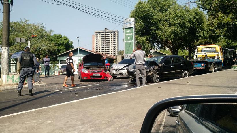 Manaus/AM - Quatro carros colidiram em um acidente na manhã deste sábado, 19, em frente à Universidade do Estado do Amazonas (UEA) no sentido Centro/bairro da Avenida Darcy Vargas, deixando duas pessoas feridas.