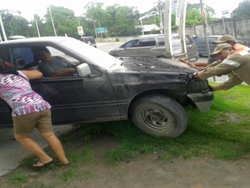 Manaus/AM – Os agentes de trânsito do Manaustrans, os “marronzinhos”, que estavam de serviço no Complexo Viário Gilberto Mestrinho tiveram um trabalho a mais neste sábado quando a Isuzu de placas, GTJ-8900, preta, sofreu princípio de incêndio e fico em pane no meio da via. Os “marronzinhos” tiveram que empurrar o veículo para um local onde atrapalhasse menos o trânsito.