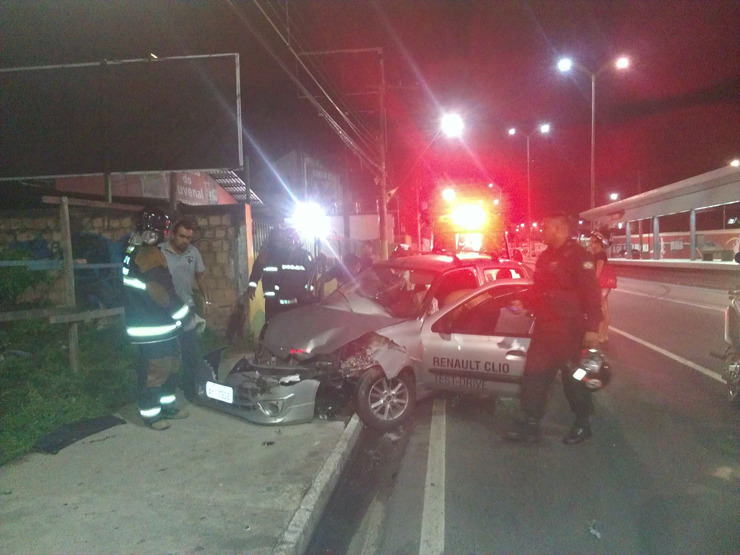 Manaus - Alfredo Souza Cavalcanti Jr saiu com ferimentos leves após bater com o carro de teste-drive da concessionária Renault , placa AYI 7305, contra a plataforma do Expresso, na avenida Constantino Nery, na madrugada deste sábado. Com o impacto, o carro capotou e foi parar em frente do hotel Dannut, do outro lado da pista. Bombeiros foram chamados ao local depois de o carro começar a esfumaçar. Com o risco de incêndio, a bateria foi desligada. Alfredo foi encaminhado ao pronto-socorro com ferimentos leves. O carro, usado em teste drive - tem placa de Curitiba e é fornecido pela montadora para que clientes das concessionárias façam testes antes de comprar veiculo da marca. Alfredo vai ter que explciar o que fazia com o carro da concessionáaria passenado na madrugada.