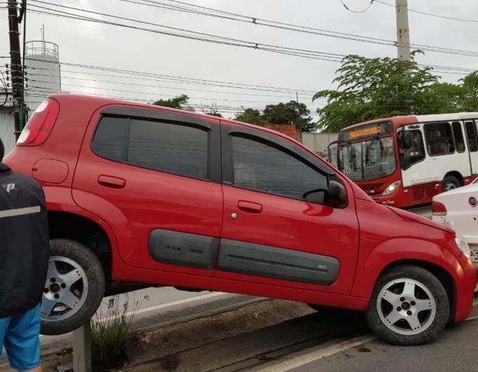 Segundo testemunhas um veículo Fiat Uno, de cor Vermelha, perdeu o controle enquanto fazia a curva, invadiu o canteiro central e ficou suspenso sobre a proteção metálica que cercava o local.