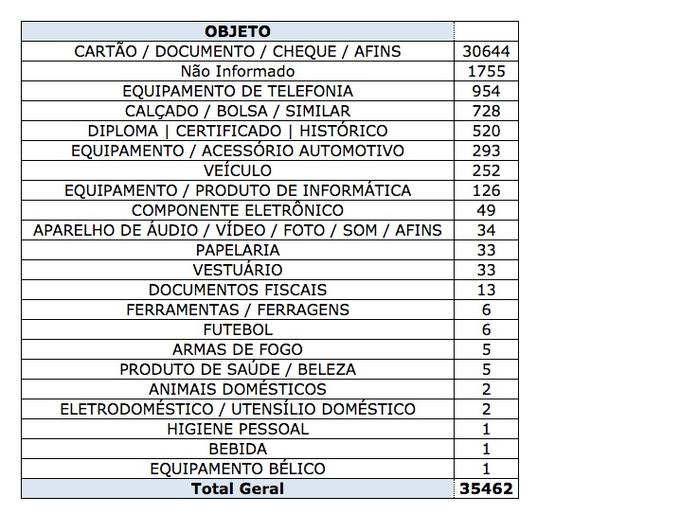 Do total de perdas e extravios, 30.644 foram de objetos no segmento de cartões, documentos pessoais e cheques. O segundo no ranking são os equipamentos de telefonia, com 954 registros. Na sequência aparecem acessórios, como bolsas e calçados, com 728 casos, e os diplomas e certificados, com 520 notificações.