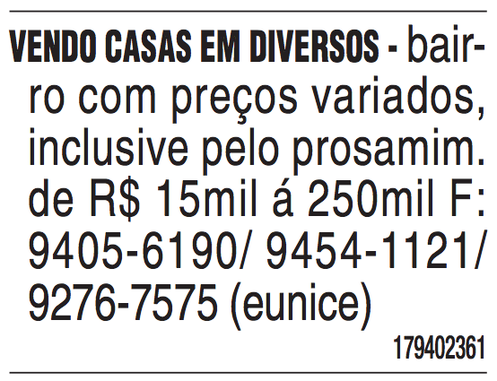 Nos classificados desta quarta-feira do jornal Diário do Amazonas aparece um anúncio de venda de casas do Programa Social e Ambiental dos Igarapés de Manaus (Prosamim).