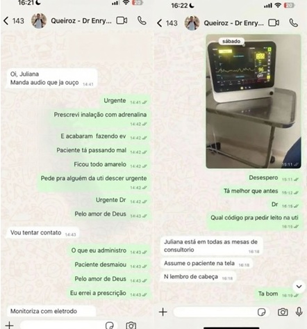 De acordo com a polícia, o médico Enryko Queiroz confirmou a troca de mensagens em depoimento. Na conversa, Juliana pede ajuda e admite: “Pelo amor de Deus. Eu errei a prescrição. Me ajuda.”