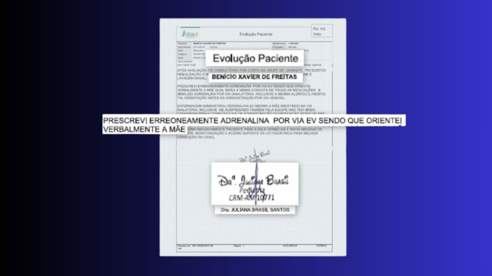 Manaus/AM- A médica Juliana Brasil Santos teria reconhecido que cometeu um erro ao prescrever adrenalina na veia de Benício Xavier, de 6 anos, que morreu após receber a medicação. A informação consta em um relatório do hospital que circula em veículos de imprensa, e teria sido enviado pela Polícia Civil.