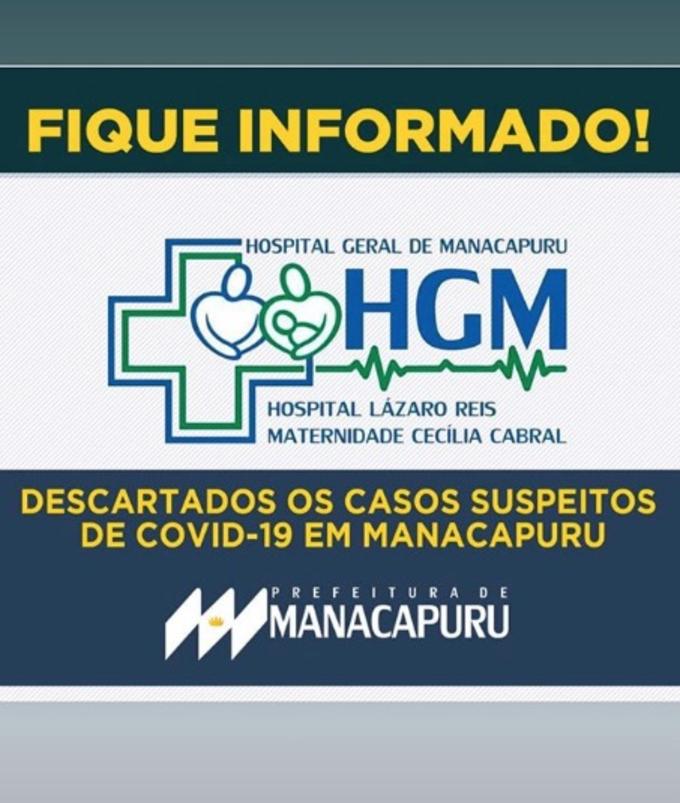 Manaus/AM - Os três casos suspeitos do novo coronavírus (Covid-19) em pacientes do Hospital Geral de Manacapuru foram descartados, conforme anúncio da prefeitura. Os casos foram divulgados na última quarta-feira (18) pelo Hospital Lázaro Reis, em pacientes com 1 ano, 22 e 23 anos.