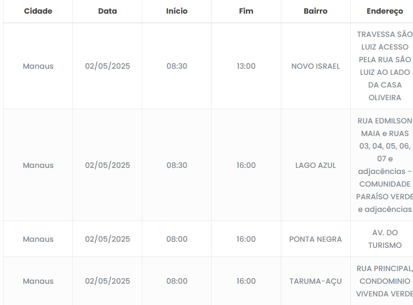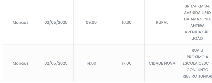 Manaus/AM – Cinco bairros da capital amazonense e uma área rural terão o fornecimento de energia elétrica temporariamente interrompido nesta sexta-feira (2).