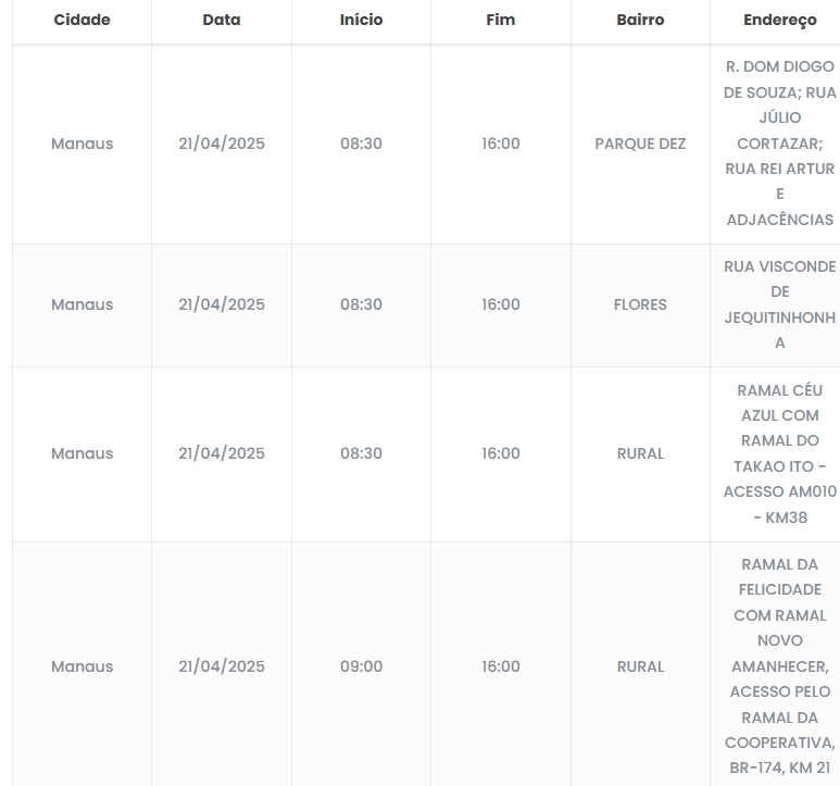Manaus/AM - Cinco bairros de Manaus e dois ramais ficarão sem energia nesta segunda-feira (21) devido a uma manutenção programada da Amazonas Energia.