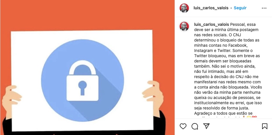 “Pessoal, essa deve ser a minha última postagem nas redes sociais. O CNJ determinou o bloqueio de todas as minhas contas no Facebook, Instagram e Twitter. Somente o Twitter bloqueou, mas em breve as demais devem ser bloqueadas também. Não sei o motivo ainda, não fui intimado, mas até em respeito à decisão do CNJ não me manifestarei nas redes mesmo com a conta ainda não bloqueada. Vocês não verão da minha parte nenhuma queixa ou acusação de pessoas, se institucionalmente eu errei, que isso seja resolvido de forma justa. Agradeço a todos que estão se manifestando, obrigado!”, escreveu o juiz.