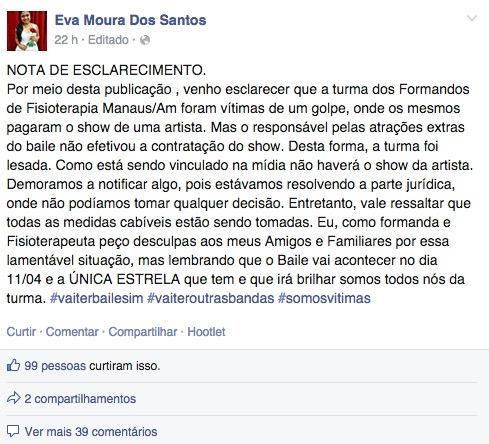 Após a cantora Preta Gil negar em sua página do Facebook que estaria em Manaus participando da Formatura de um grupo de formandos de fisioterapia, vários alunos e amigos lamentaram a situação que teria acontecido por causa de um dos alunos.