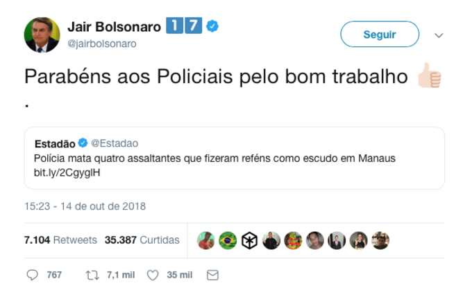 “Parabéns aos Policiais pelo bom trabalho.”, escreveu Bolsonaro, ao republicar uma notícia do Portal O Estado de São Paulo sobre a ação policial que resultou na morte de quatro assaltantes e o resgate com vida de todos os reféns.