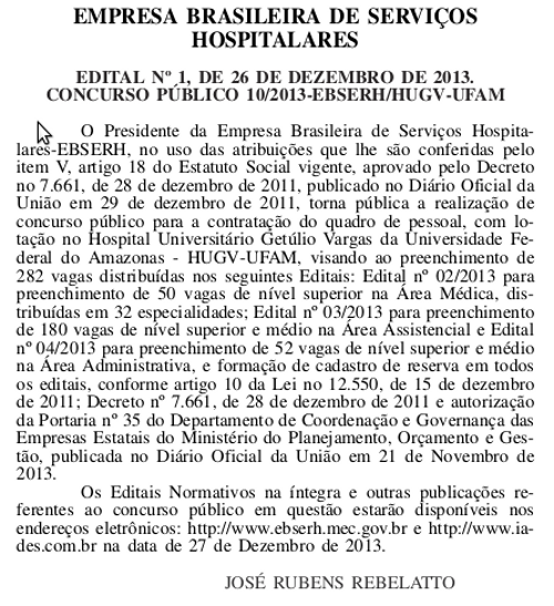 A Empresa Brasileira de Serviços Hospitalares está anunciado a abertura de concurso para o preenchimento de 282 vagas no Hospital Universitário Getúlio Vargas, de Manaus. As vagas são destinadas a várias especialidades. Confira: