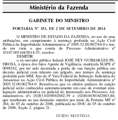 Condenado em 2008 por crime de improbidade administrativa, o servidor da Fundação de Vigilância Sanitária no Estado do Amazonas, José Ney Guimarães Pedrosa, foi demitido apenas no último dia 2, portanto seis anos depois de sentença transitada em julgado, pelo ministro da Fazenda. Guido Mantega. A decisão está publicada no Diário Oficial da União que circulou nesta quinta-feira.