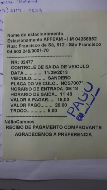 Em um estacionamento em frente à SEFAZ, ficando um pouco mais de 2 horas, você vai desembolsar R$ 15