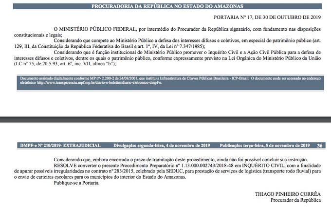 Manaus/AM - Um contrato de R$ 6,7 milhões entre a Secretaria de Estado de Educação do Amazonas (Seduc) com a empresa Aliança Serviços de Edificação e Transporte Ltda., está sendo alvo de investigação do Ministério Público Federal (MPF) para apurar possíveis irregularidades. O contrato fechado em 2015 tinha o objetivo de realizar o transporte rodofluvial de carteiras escolares para municípios do interior do Amazonas.