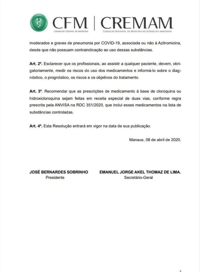Manaus/AM - O Conselho Regional de Medicina do Amazonas, publicou na tarde desta quarta-feira (9), a recomendação para o uso de cloroquina e hidroxicloroquina para pacientes com coronavírus no Amazonas.