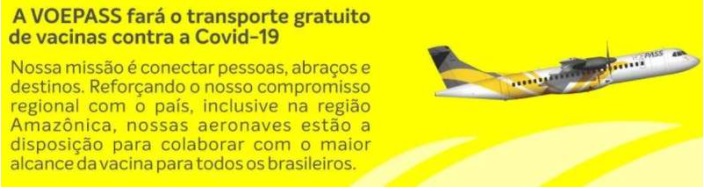 Manaus/AM - As companhias aéreas Azul e VoePass, antiga MAP Linhas Aéreas, anunciaram que estão disponíveis para transportar gratuitamente as vacinas contra a covid-19 no interior do Amazonas. O transporte e as cidades atendidas serão definidos pelo Ministério da Saúde.
