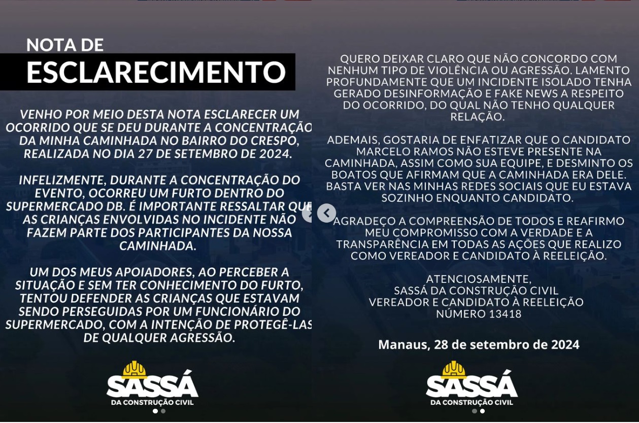 "Venho por meio desta nota esclarecer um ocorrido que se deu durante a concentração da minha caminhada no bairro do Crespo, realizada no dia 27 de setembro de 2024. Infelizmente, durante a concentração do evento, ocorreu um furto dentro do supermercado DB. É importante ressaltar que as crianças envolvidas no incidente não fazem parte dos participantes da nossa caminhada.