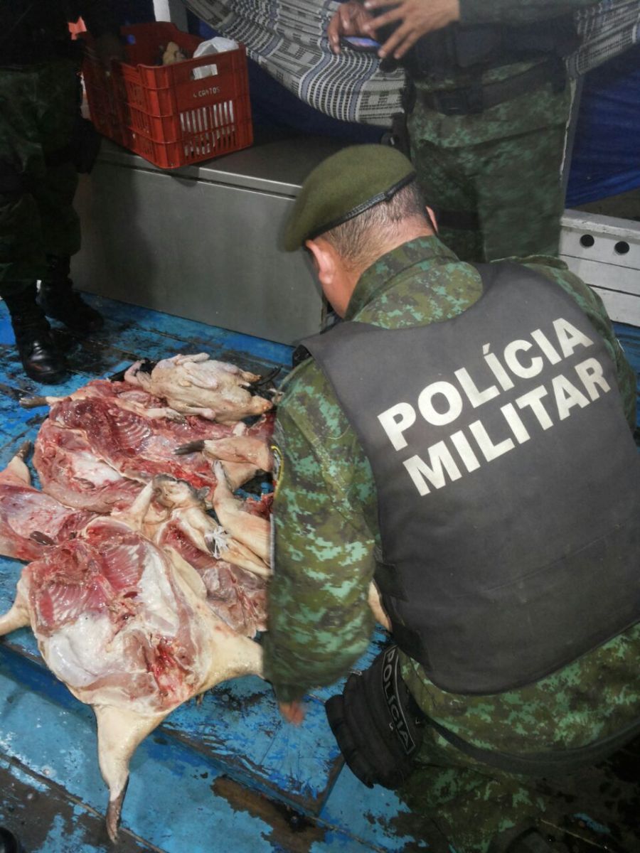 Manaus/Am - Uma fiscalização da Polícia Ambiental na Balsa do Peixe da Feira da Panair resultou na apreensão de carne de caça. no barco pesqueiro "Fantástico", de propriedade de Bira. O barco havia chega a Manaus procedente de Beruri e trazia em seu interior carne de caça, pirarucu e quelônios, além de uma carga de tambaqui abaixo do tamanho permitido.