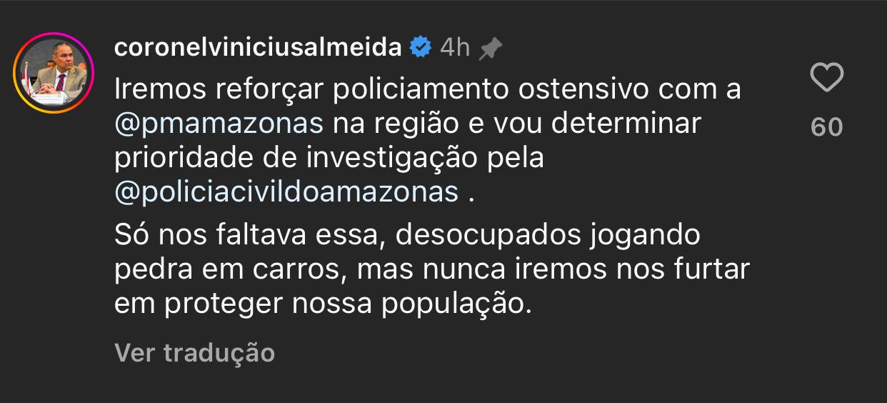Nas redes sociais, o secretário de Segurança Pública (SSP-AM), Coronel Vinícius Almeida informou que vai determinar investigação para identificar os criminosos. Além disso, o policiamento na área será reforçado.