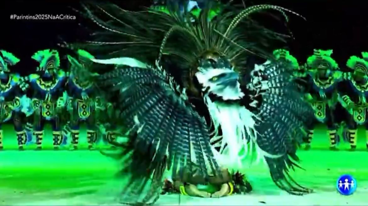 A cunhã-poranga azulada, um dos itens mais esperados da apresentação do Boi Caprichoso, surgiu logo no começo do espetáculo, durante a lenda do Yurupari, uma figura central na mitologia de diversos povos indígenas da Amazônia, principalmente os das famílias Tukano, Arawak e Tupi-Guarani, no Brasil e na Colômbia.