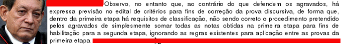 O relator da matéria, desembargador Wellington José de Araújo diz em seu parecer, aprovado por unanimidade, que "não é possível acolher os argumentos dos agravados no sentido de interpretar literalmente o disposto no item 11.1 do edital em questão, que tratou genericamente da apuração da nota final da primeira etapa do certame" e que "se houve previsão no edital de critérios para correção da prova discursiva, é evidente que tal norma também deve ser observada em momento anterior a apuração da nota final da