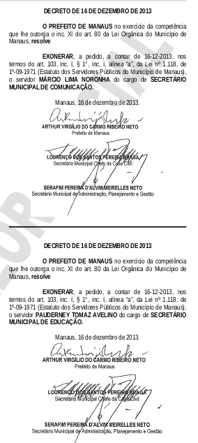 Todos os secretários substituidos nesta segunda-feira pelo prefeito Artur Neto enviaram cartas solicitando o desligamento do cargo que ocupavam na administração municipal, menos o secretário de infraestrutura e vice-prefeito de Manaus, Hissa Abrahão, único no qual o ato de exoneração não consta o "a pedido. Confira: