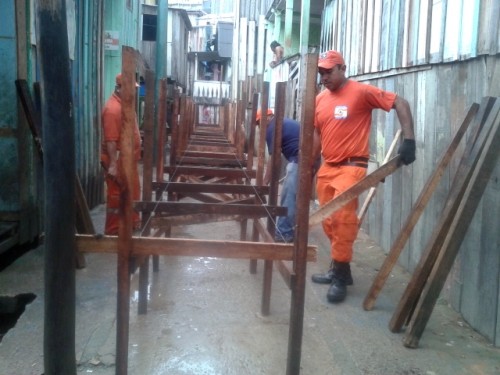 Nesta quinta, os técnicos concluíram a construção de 75 metros de ponte no Beco João Batista II, bairro Educandos, Zona Sul de Manaus. Essa é a quinta ponte construída das 39 que fazem parte do cronograma de ações preventivas para a cheia de 2014.