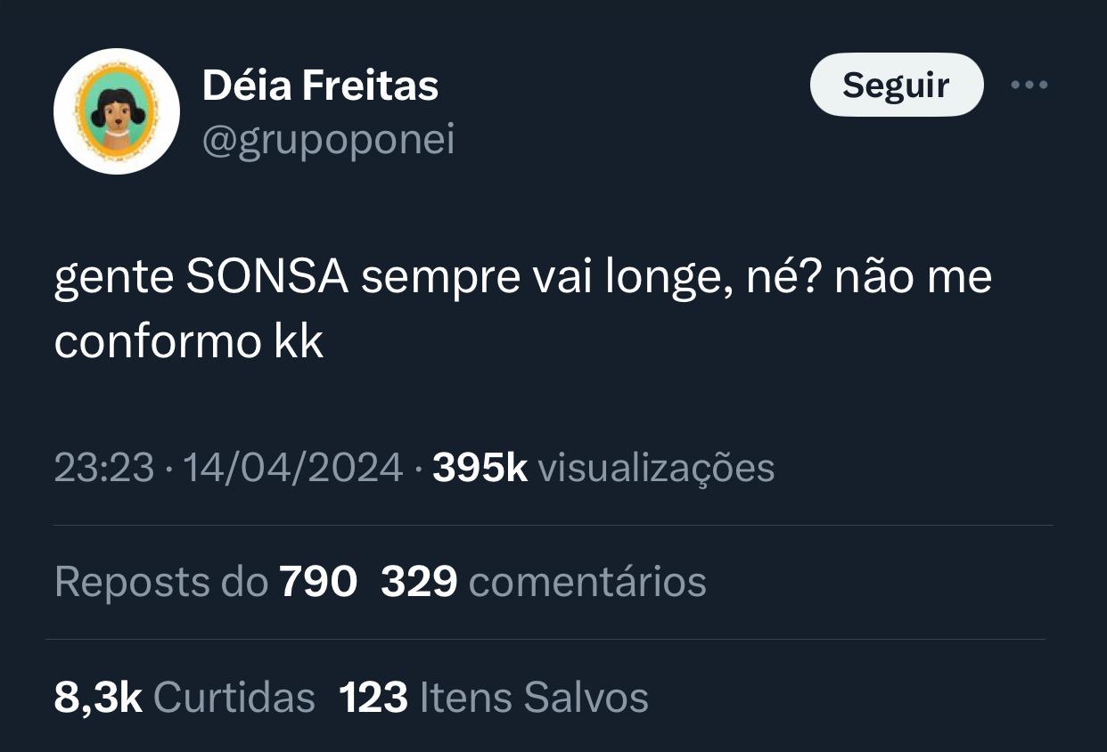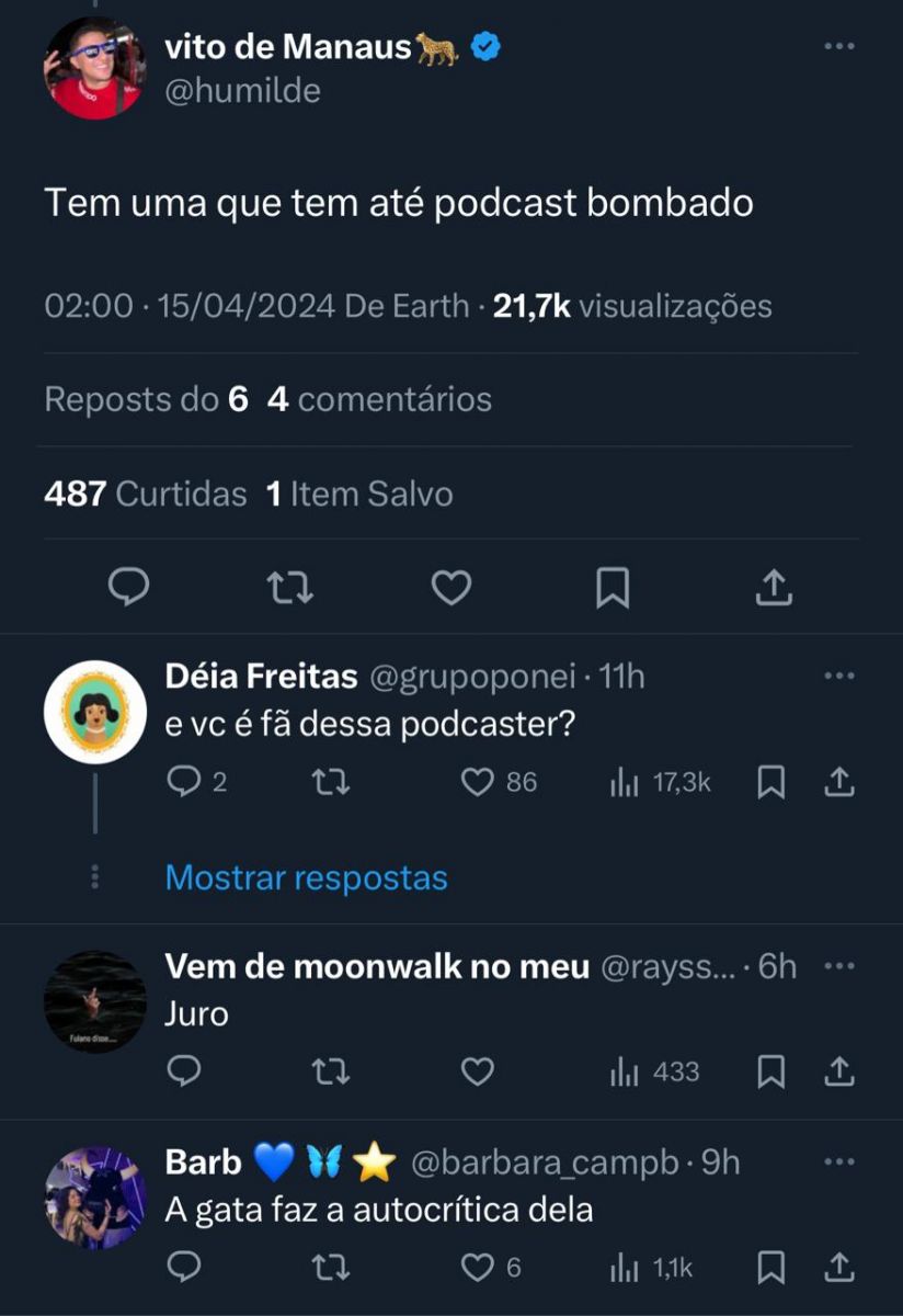 "gente SONSA sempre vai longe, né? não me conformo kk", postou Déia Freitas. Logo em seguida, o post lotou com respostas de amazonenses em defesa de Isabelle e revoltados com a postura da podcaster.