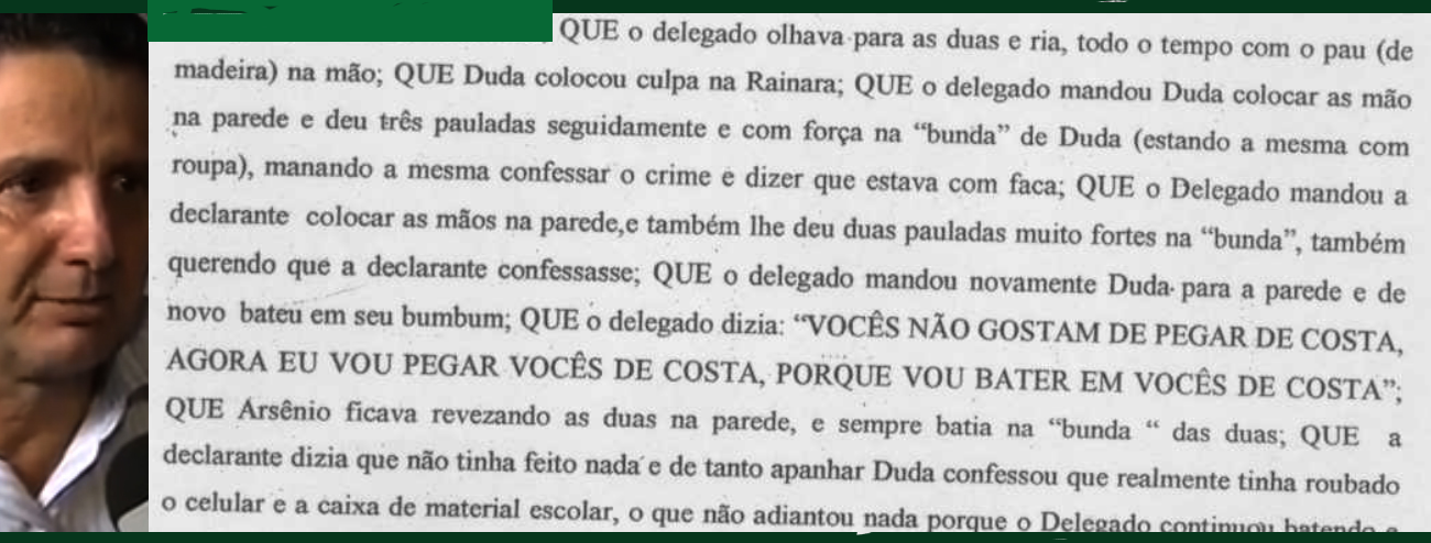 De acordo com as vítimas, com uma ripa o delegado as trancou em uma sala no Distrito Policial e começou a bater nas nádegas e nas mãos delas e ainda afirmou que as duas seriam estupradas caso não confessassem suposta participação em roubo ocorrido nas proximidades do supermercado DB, da Cidade Nova.