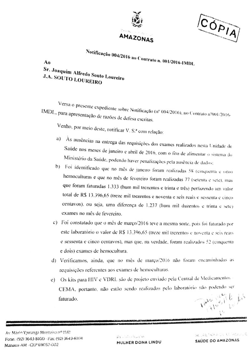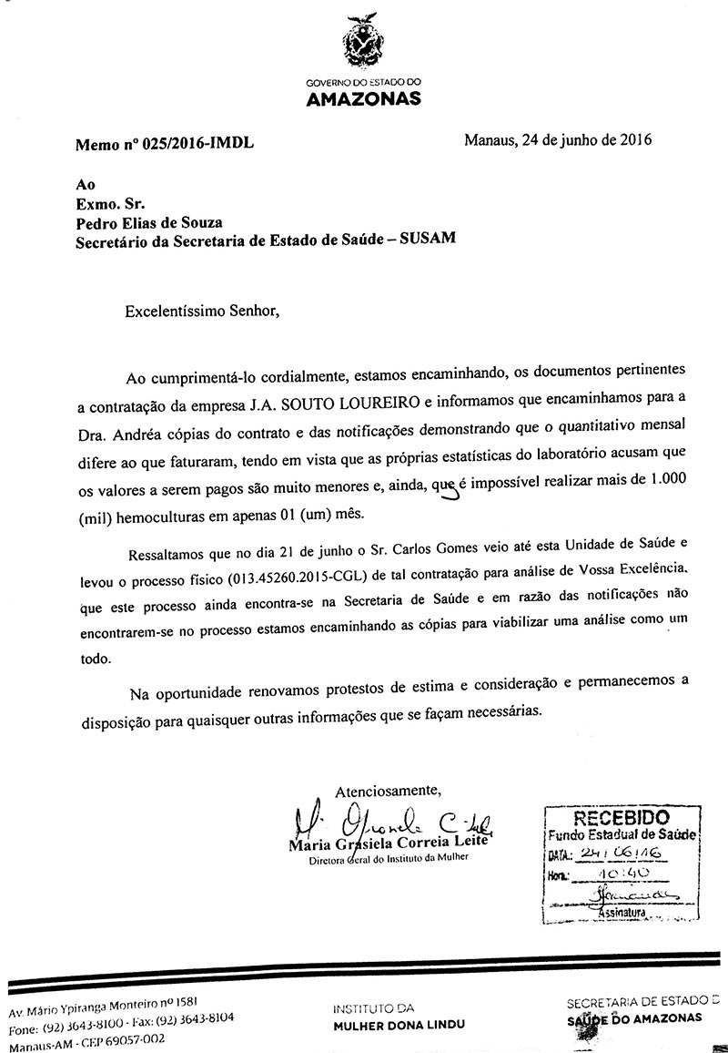 Manaus/AM - Em junho de 2016, a presidente do Instituto da Mulher Dona Lindu, Maria Grasiela Leite, revelou em um memorando destinado ao então secretário da saúde, Pedro Elias, que a empresa J. A. Souto Loureiro estava recebendo por exames não realizados.