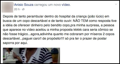 Conforme o denunciante em sua página no Facebook, após buscar um copo e ouvir “não tem”, ele diz ter oferecido uma quantia e prontamente atendido por uma funcionária do hospital que trouxe alguns copos descartáveis, pegou a nota de R$ 5 reais do homem e em seguida voltou com o troco.
