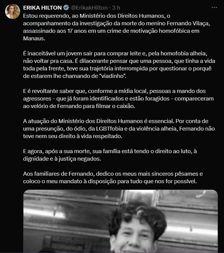 A deputada federal Érika Hilton (PSOL-SP) solicitou ao Ministério dos Direitos Humanos o acompanhamento das investigações sobre a morte de Fernando Vilaça, de 17 anos, que foi brutalmente espancado em Manaus. O crime ocorreu na quarta-feira (02), no bairro Gilberto Mestrinho, zona Leste da capital amazonense.